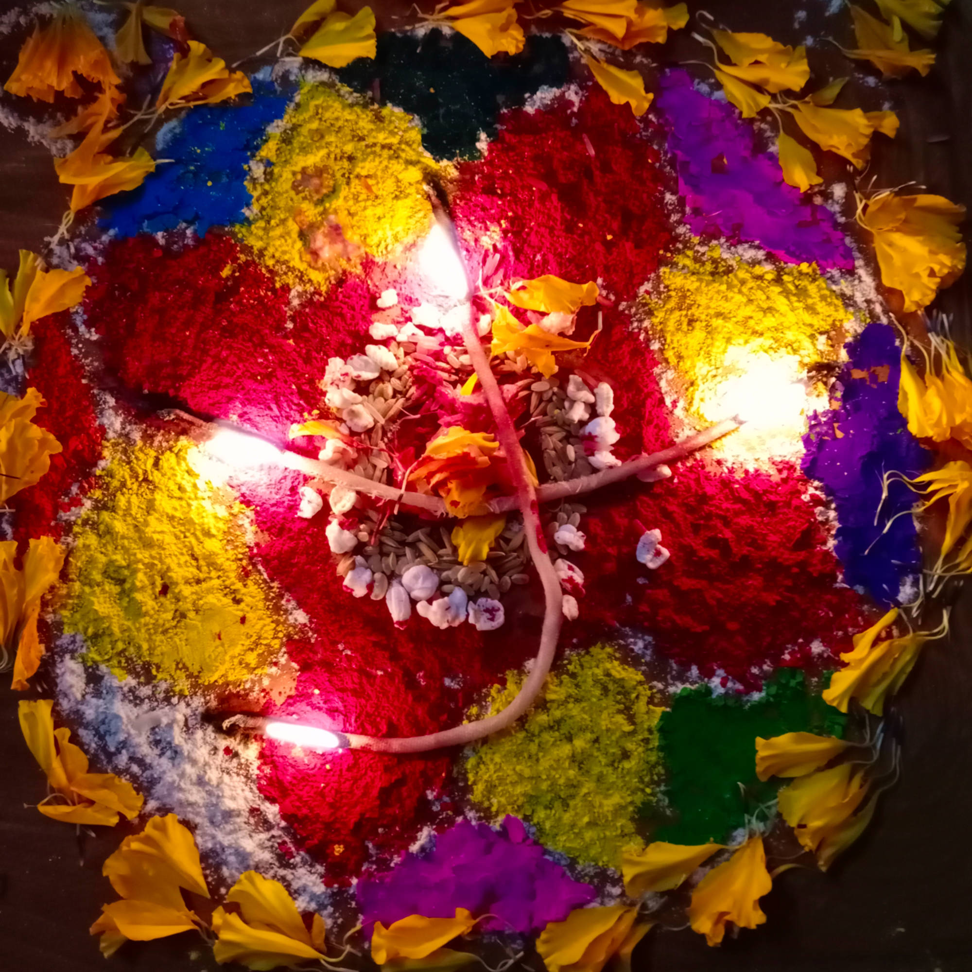 tika on each person’s forehead and lights small cotton wicks beside the Mandala, symbolizing the light of wisdom and the removal of darkness. She also offers a holy thread and a citron fruit to every family member, both of which are considered auspicious symbols of good fortune and protection from harm.